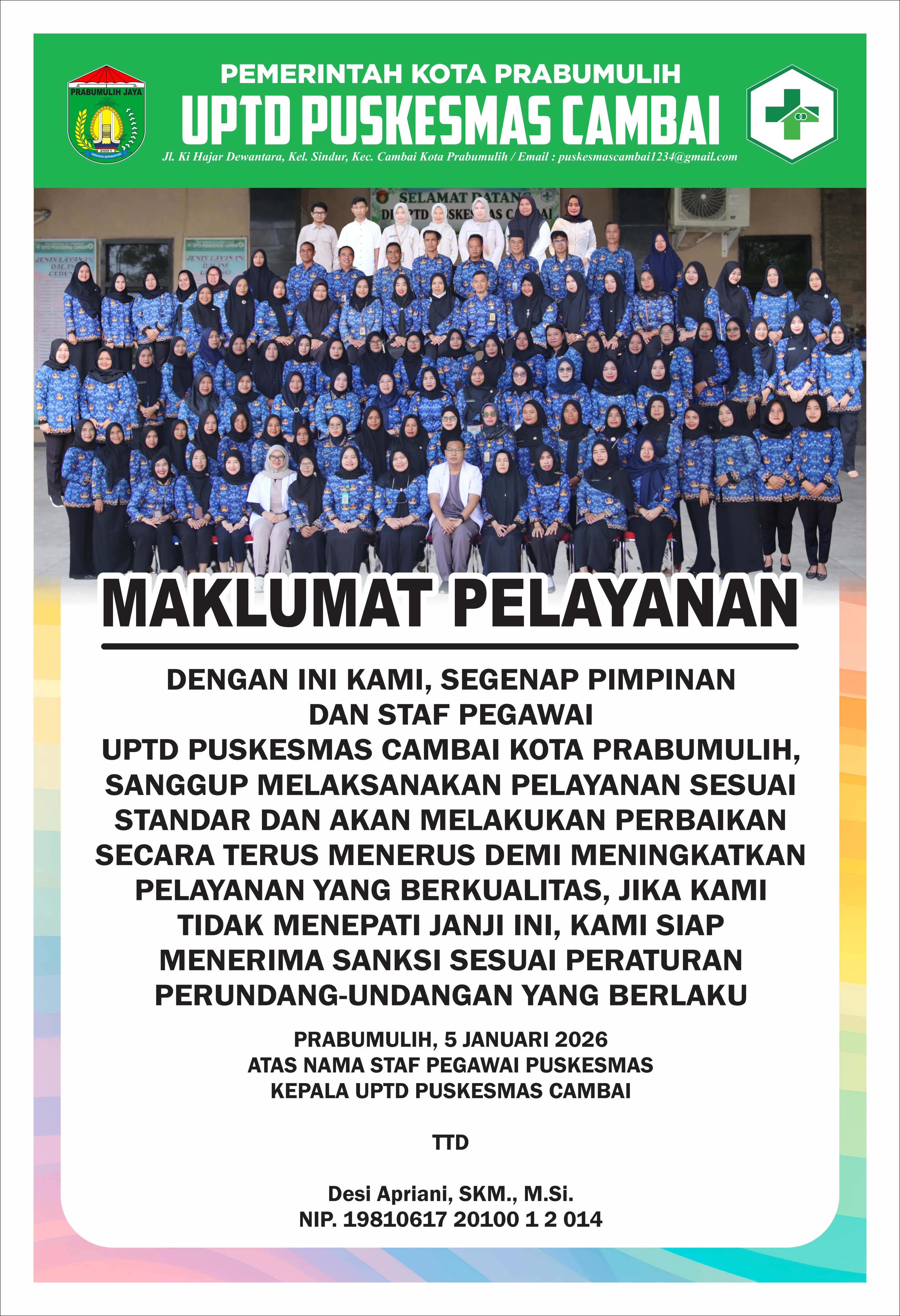 Keterangan Gambar : Maklumat Pelayanan UPTD Puskesmas Cambai Tahun 2026