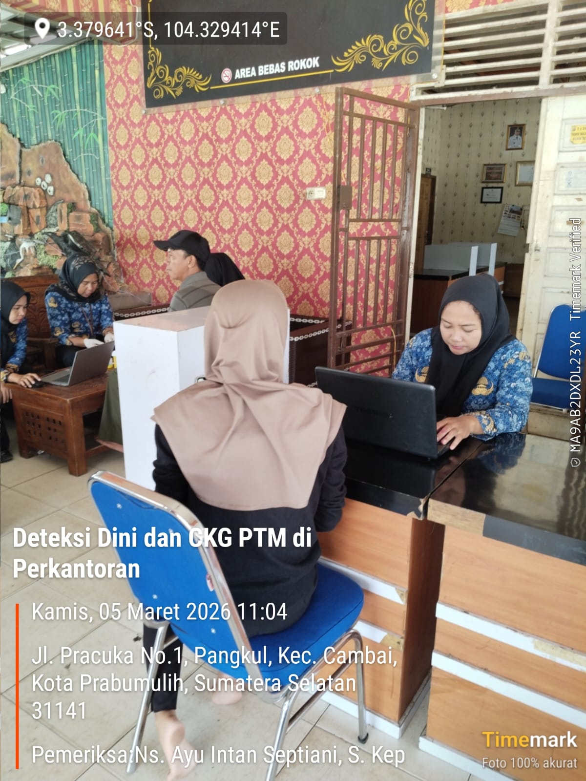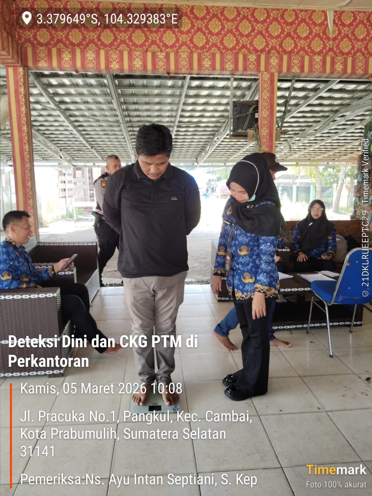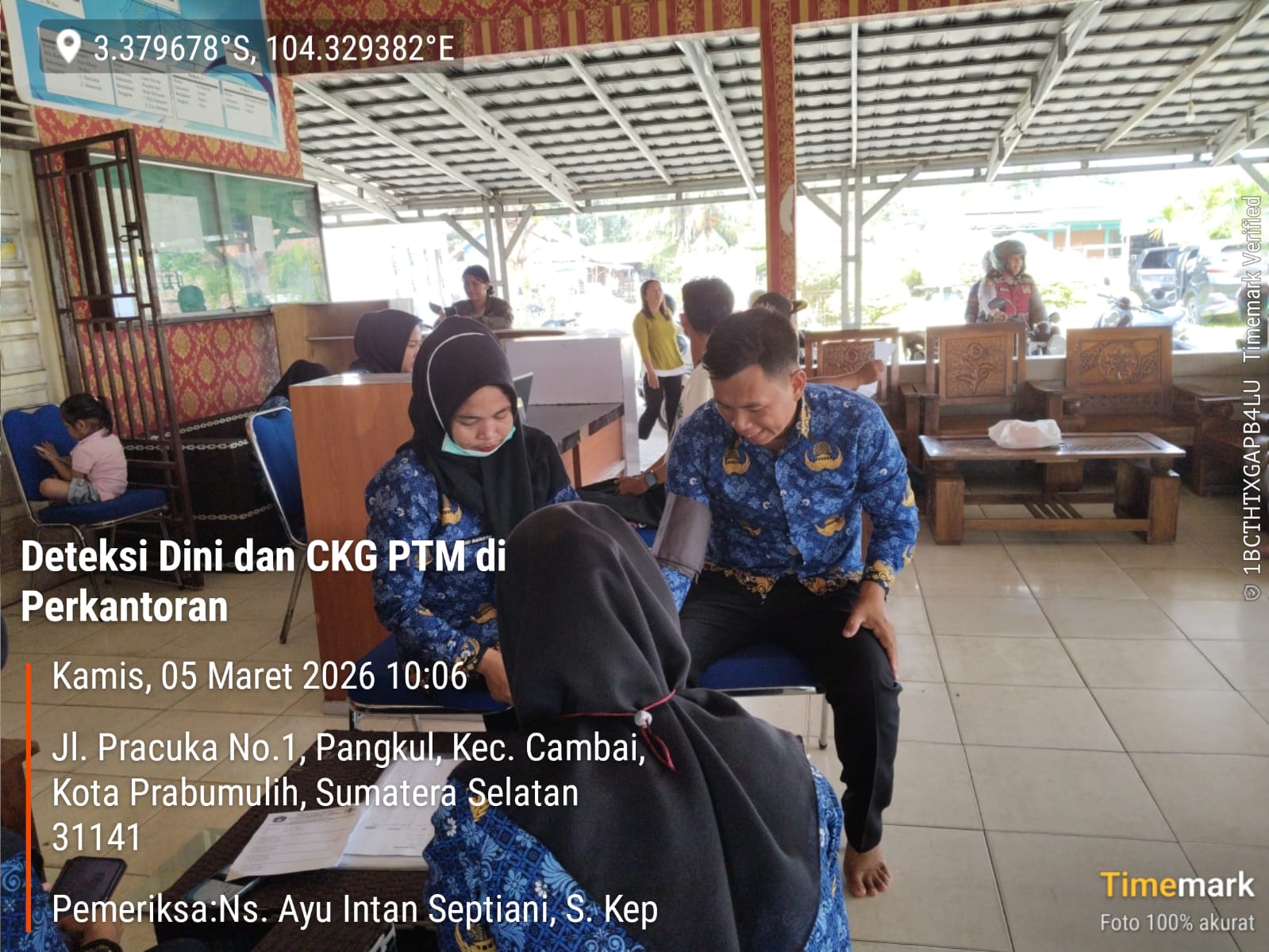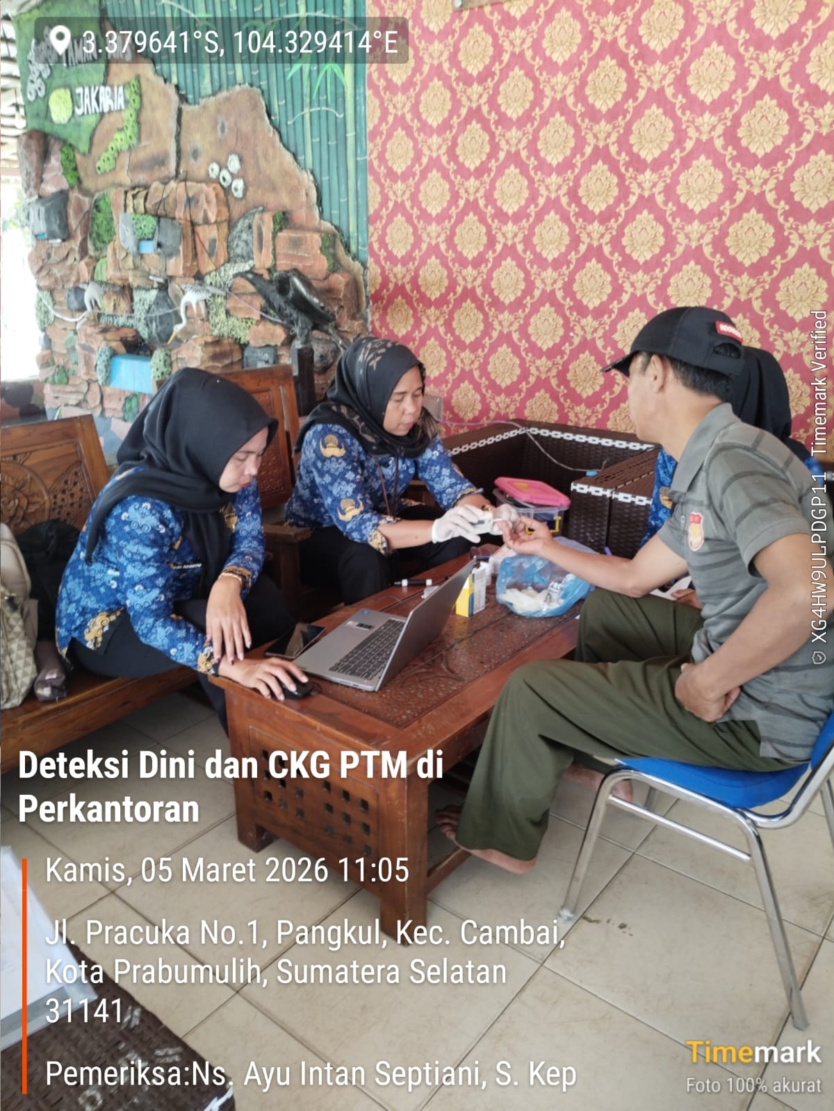 Keterangan Gambar : Kegiatan deteksi dini dan Cek kesehatan gratis (CKG) Penyakit Tidak Menular di Perkantoran Wilayah kerja UPTD Puskesmas Cambai, Kamis 05 Maret 2026 di Kantor Kepala Desa Pangkul